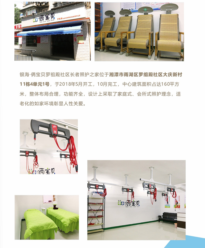銀?!z寶貝羅祖殿社區(qū)長者照護之家位于湘潭市雨湖區(qū)羅組殿社區(qū)大慶新村11棟4單元1號,于2018年5月開工,10月完工,中心建筑面積占達160平方米,整體布局合理,功能齊全,設計上采取了家庭式、會所式照護理念,適老化的如家環(huán)境彰顯人性關愛。