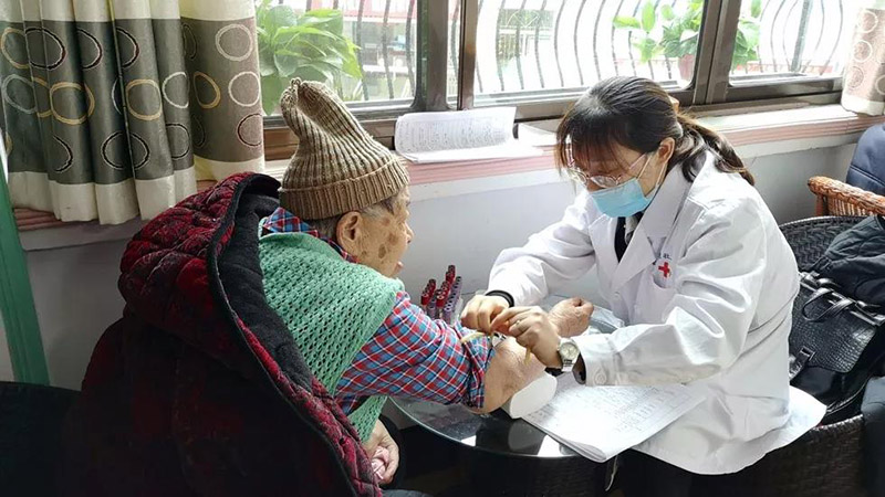 一邊耐心細(xì)致地為每一位老人進(jìn)行量血壓、稱體重、抽血、尿檢、B超、心電圖等各項(xiàng)檢測(cè)。