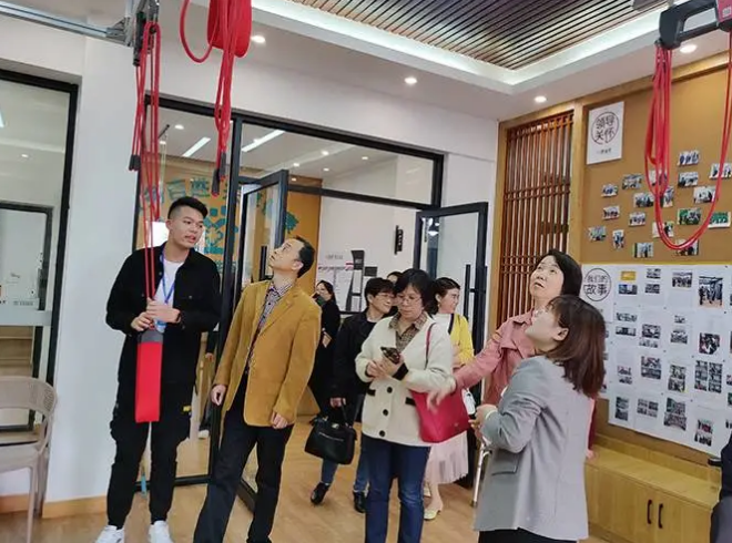 參觀過(guò)程中,戚局長(zhǎng)一行被院內(nèi)康復(fù)系統(tǒng)——挪威SET紅繩吸引住了眼球。紅繩康復(fù)訓(xùn)練是銀海倆寶貝于2016年從挪威引進(jìn)SET康復(fù)設(shè)備及其訓(xùn)練體系,目前是湖南省首家引進(jìn)此系統(tǒng)用于老年康復(fù)的機(jī)構(gòu)。