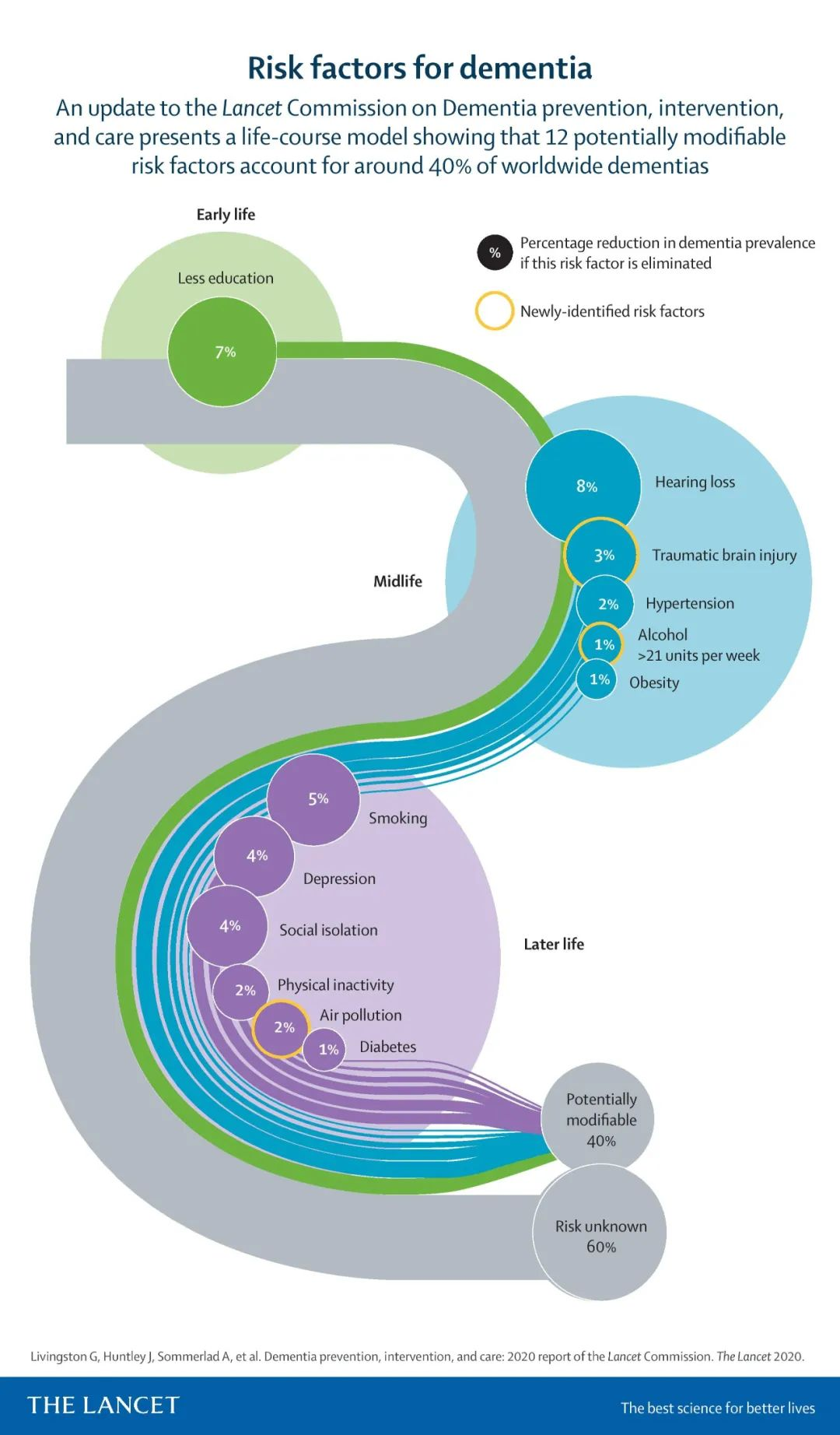 2020年阿爾茨海默病協(xié)會(huì)國(guó)際會(huì)議(AAIC)上,《柳葉刀》雜志委員會(huì)發(fā)表了最新的認(rèn)知癥預(yù)防措施,提出改變12個(gè)危險(xiǎn)因素,可預(yù)防或延遲多達(dá)40%的認(rèn)知癥病例。其中,包括維持聽(tīng)力、保持腿部健康都上榜。