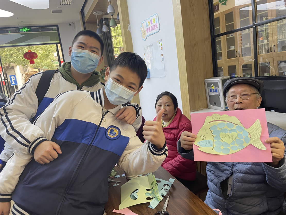 “爺爺,您喜歡這個(gè)顏色是嗎?下面我?guī)椭黄鸢阉舫鰜砗脝??”、“奶奶,您平常都有些什么愛好呀,可以跟我們說說您的故事嗎?”……只見同學(xué)們有的蹲坐在老人旁邊,有的則是伏耳于他們面前,耐心認(rèn)真地和爺爺奶奶們進(jìn)行交流,其他的人則是分工協(xié)作,完成“魚”的其他部位制作。不多久,一條條色彩斑斕,創(chuàng)意十足的“魚”就做好啦!爺爺奶奶們拿著完成的作品分別和自己的“小伙伴”們合影留念,再次感謝他們的到來!