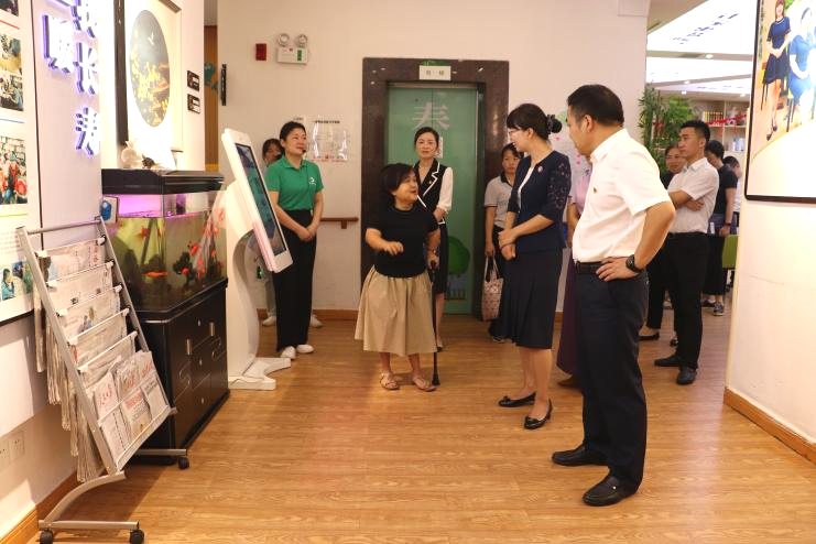 董事長王朝暉女士帶領(lǐng)導(dǎo)一行先后參觀了銀海倆寶貝窯灣康養(yǎng)中心的藥房、文化墻、多功能活動室、各類助老設(shè)施、護士站、綜合養(yǎng)老服務(wù)平臺、年齡博物館、陽光花房等地。