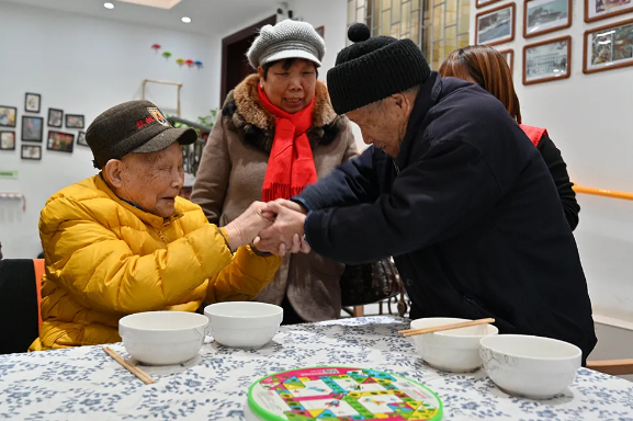 工作人員擺放桌椅時,爺爺總忙不迭地要搭手幫忙;看到地上有垃圾時,爺爺常常拿起掃把一下就收拾干凈;爺爺奶奶們玩游戲時,他總在背后默默地關(guān)注著準備隨時協(xié)助,臉上總是掛著慈祥的笑容;90多歲的高齡,身體仍然這么健碩硬朗,和爺爺?shù)暮眯膽B(tài)、好性格有著密不可分的關(guān)系。