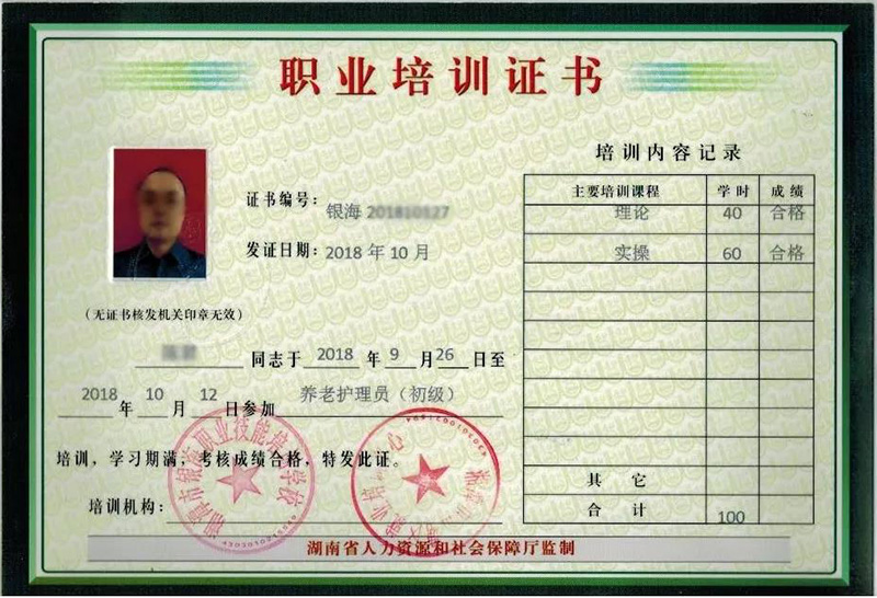 鍒濈駭銆佷腑綰у吇鑰佹姢鐞嗗憳璧勬牸璇佷功鏄箻娼競(jìng)灝變笟鍩硅涓績(jī)棰佸彂鐨勮亴涓氬煿璁瘉涔︺?/span>
