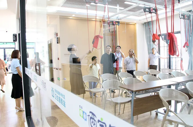 參觀了中心藥房、護(hù)士站、康復(fù)紅繩多功能室、智能化康復(fù)機(jī)器人設(shè)備陽光房、智能化護(hù)理型樣板間、餐廳、廚房及健康管理中心、娛樂中心,并與入住老人們親切交談,詢問了老人的起居飲食等多方面的情況,并送上暖心的健康祝福。