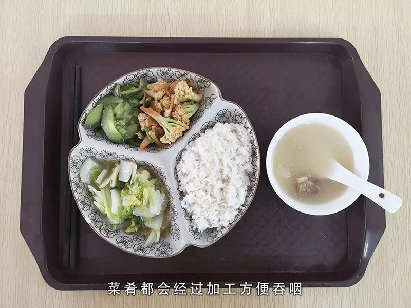 院內(nèi)廚房現(xiàn)做的午餐,美味可口,營養(yǎng)均衡。菜肴都會(huì)經(jīng)過加工方便吞咽,而且還可以選擇少放鹽的健康套餐。