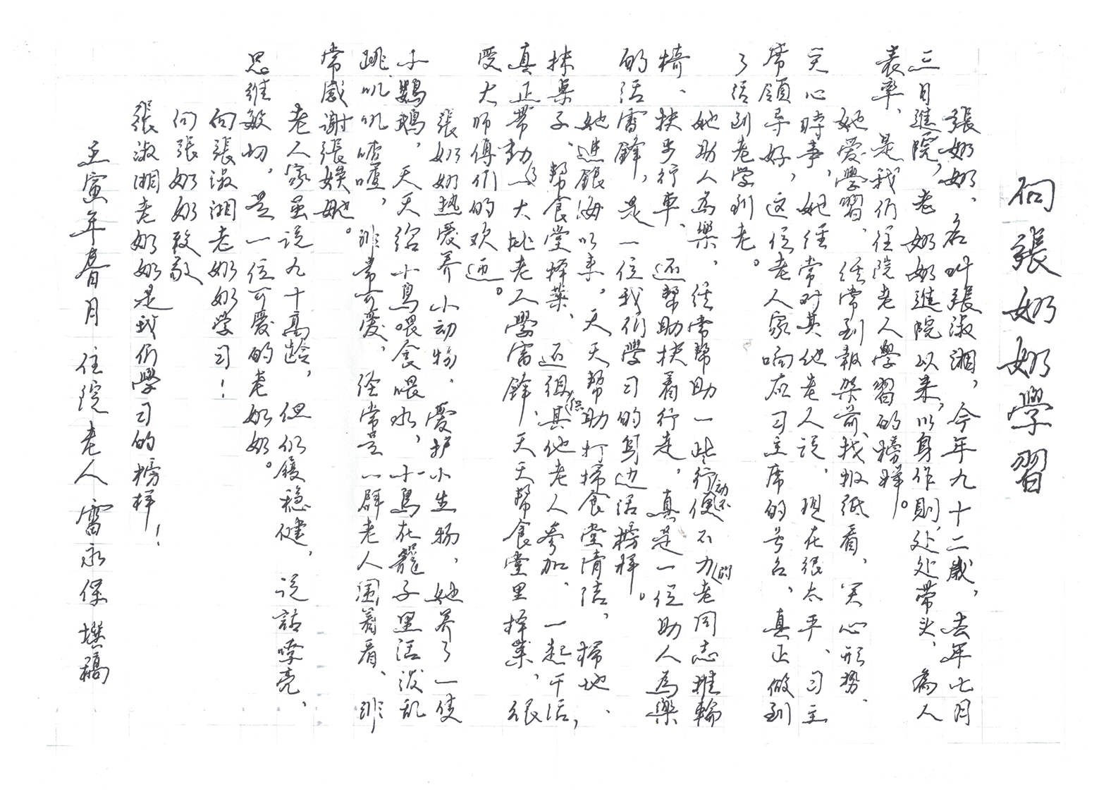 張奶奶,名叫張淑湘,今年九十二歲,去年七月三日進(jìn)院,老奶奶進(jìn)院以來(lái),以身作則,處處帶頭,為人表率,是我們住院老人學(xué)習(xí)的榜樣。