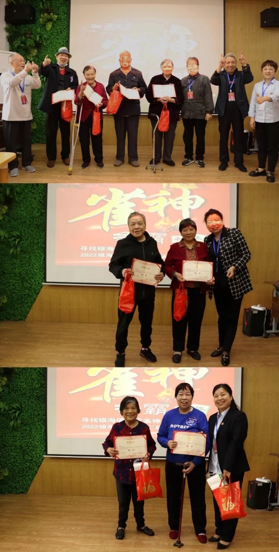 來自長者委員會的雷永保爺爺、王素秋奶奶和張建中爺爺,唐興寺社區(qū)長者康養(yǎng)中心的戴靜院長以及銀海家政的周書記分別給季軍、亞軍和冠軍頒獎(jiǎng),其他未獲獎(jiǎng)的老人也有一份小禮品,每位老人臉上都洋溢著喜悅的笑容。