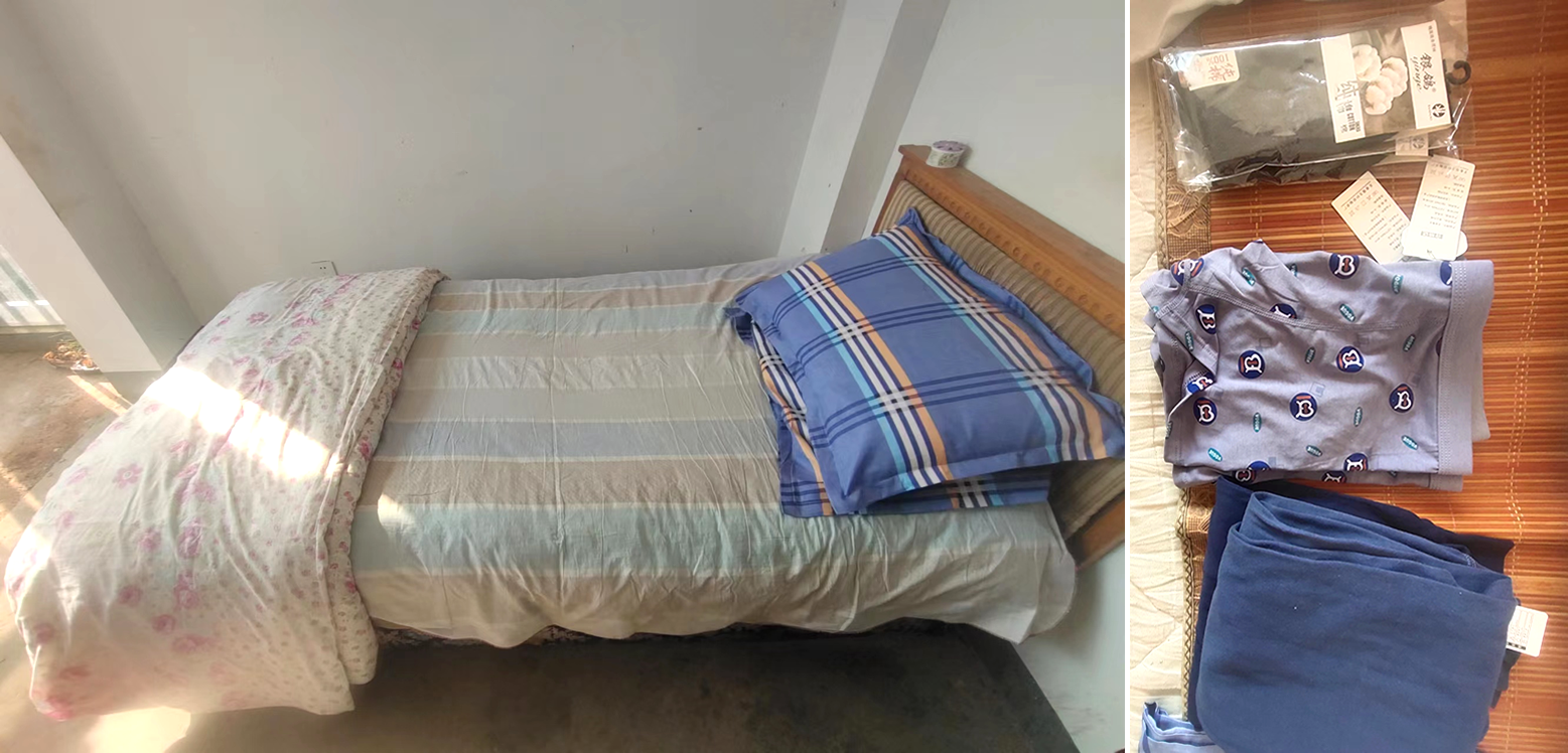 重新鋪好的床鋪和新買的內(nèi)褲、保暖褲、襪子