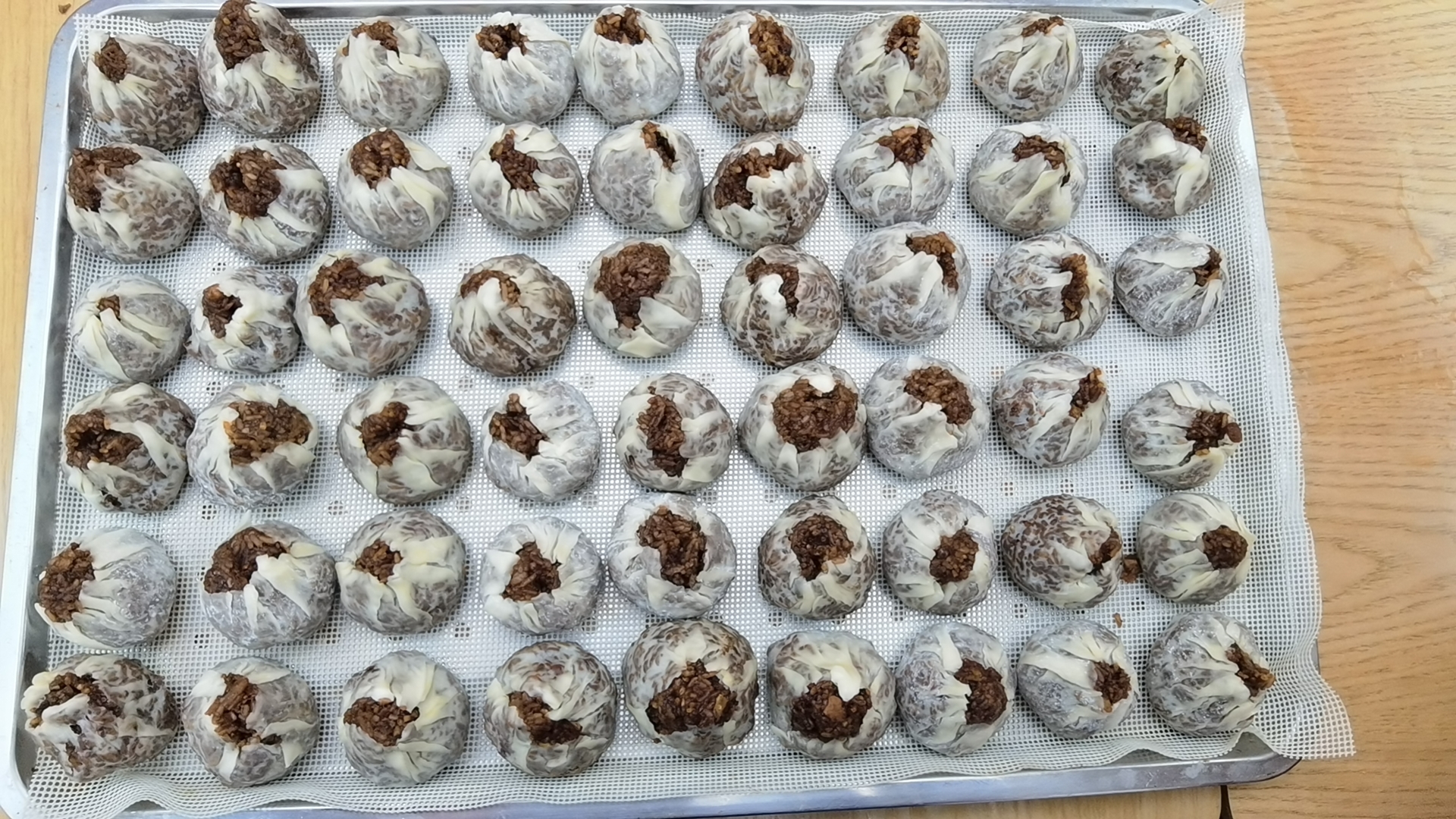 只見兩位“白案”師傅早早地就準(zhǔn)備好了糯米,燒麥皮等,食材整整齊齊的放在桌上,期待已久的爺爺奶奶們紛紛卷起袖子,興致勃勃的悉數(shù)出席,在師傅們的指導(dǎo)下左手托皮,右手把餡心捏成圓形,放在皮子中間,輕輕一捏后順勢將餡料往里一壓,然后慢慢收成小山狀。這樣,一個(gè)飽滿的燒賣就做好啦!不一會兒,圓滾滾胖嘟嘟的燒麥就放滿了一大盤。